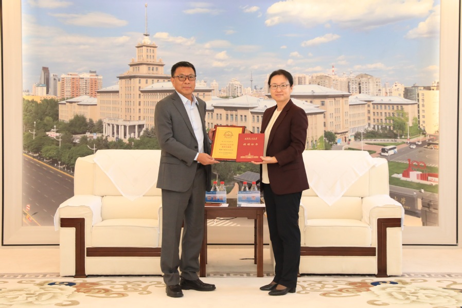 副校长、哈工大教育发展基金会副理事长孙雪分别向宗润福校友和沈阳芯源微电子设备股份有限公司颁发捐赠教育贡献奖奖牌和捐赠证书。