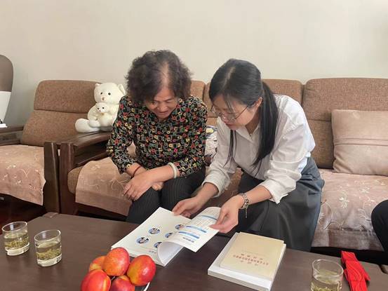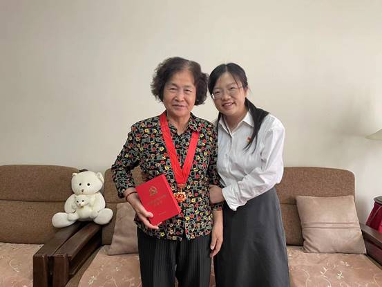 在老党员家中,聂秋月为胡桂珍同志颁发并佩戴纪念章,感谢胡桂珍同志为党的事业和学校、学院发展作出的贡献,希望胡老师保重身体,继续关心、支持学院工作。聂秋月还为胡桂珍同志送上党纪学习教育等书籍,并介绍了近年来学校、学院的发展情况。