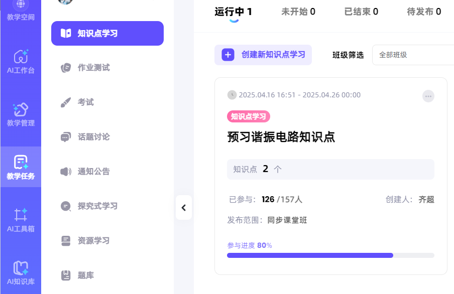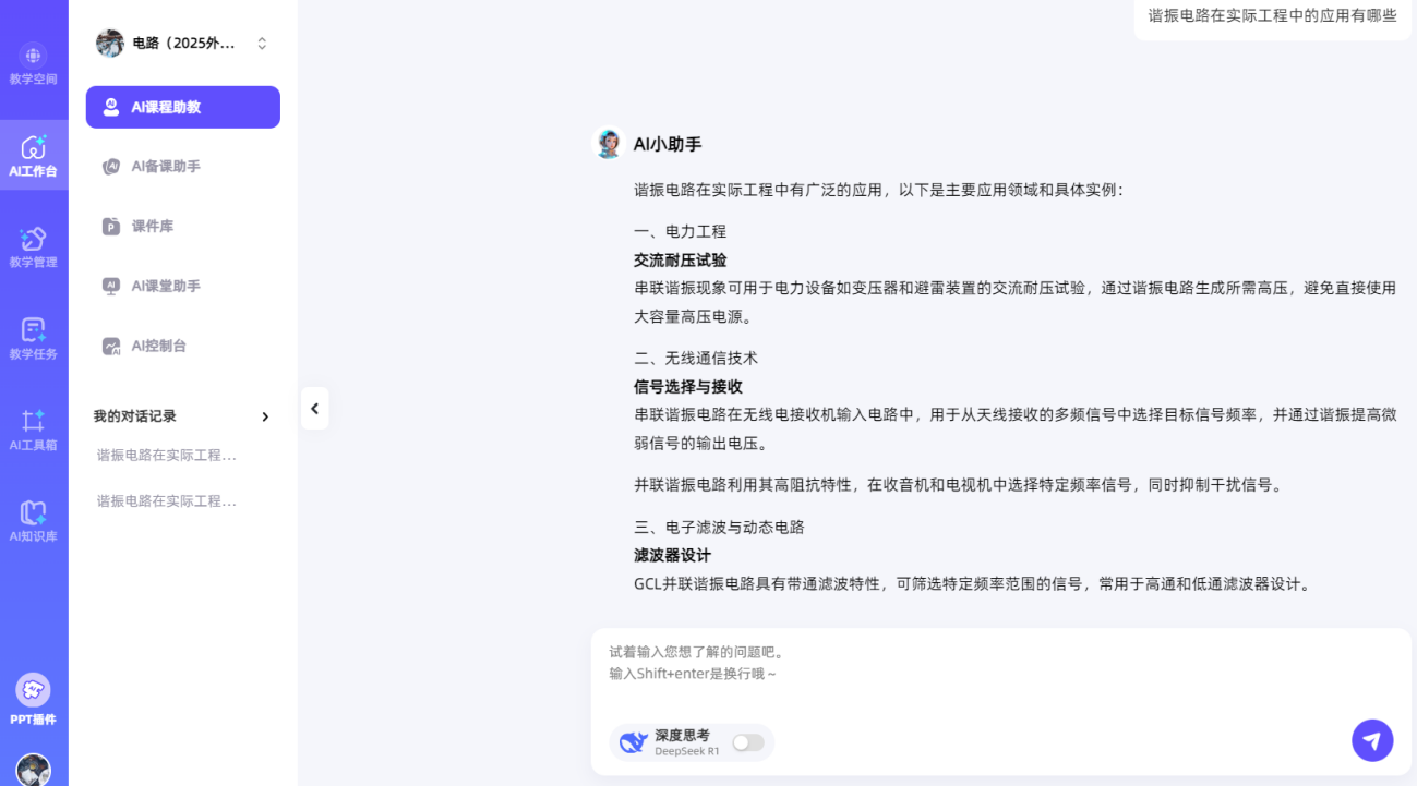 本次同步课堂,课前齐超老师与新疆工程学院杨斌山老师共同开展教学研究备课会,研讨教学方案,通过智慧课堂发布预习任务(如图1所示),学生自主学习提升同步课堂教学效果。课上齐超老师基于BOPPPS教学模式讲授了“谐振电路”的相关知识(如图2所示),并利用AI课堂助手和AI工作台课堂时光机实时发布课堂测试、得到学生作答反馈情况。首先从力学共振、声学共鸣、电学谐振中的经典案例入手引入谐振概念,介绍了网络函数和谐振电路的基本知识点,通过互动式教学方法生动地讲解了串/并联谐振电路的特点(如图3所示);再以谐振电路在无线电能传输中的应用实例,将科研成果深度融入教学;并引出该领域有待解决的关键问题,引导学生课后查阅相关资料掌握最新学术前沿,激发了学生从事科学研究的兴趣。课上齐超老师将电路中的同频共振现象与同学们的奋斗目标与中华民族伟大复兴紧密联系,将课程思政潜移默化地融入教学。