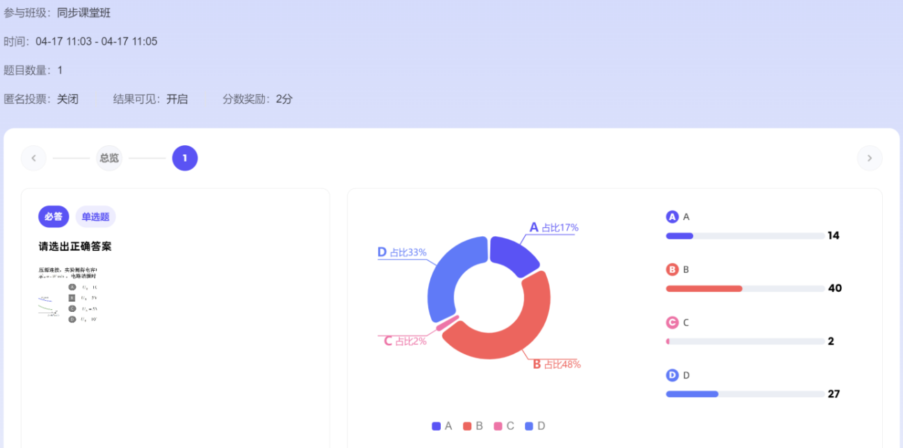 本次课程基于AI智慧课程,融入AI助手、AI资源等人工智能技术,实现了AI赋能翻转课堂。借助AI课程助教输入学生希望了解的问题,比如谐振电路在实际工程中的主要应用领域和具体实例等(如图5所示),便于学生能够将理论知识和实际工程应用紧密结合;教学过程中利用AI课堂助手/灵动课堂发布前测和后测习题(如图6所示),通过AI工作台课堂时光机反馈得到学生作答情况(如图7所示),便于实时掌握学生对相关知识点的掌握情况,进行教学的动态调整。